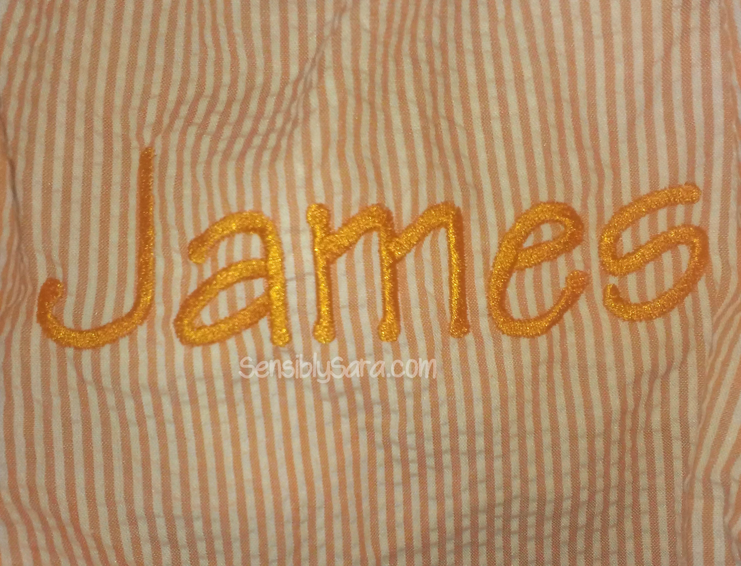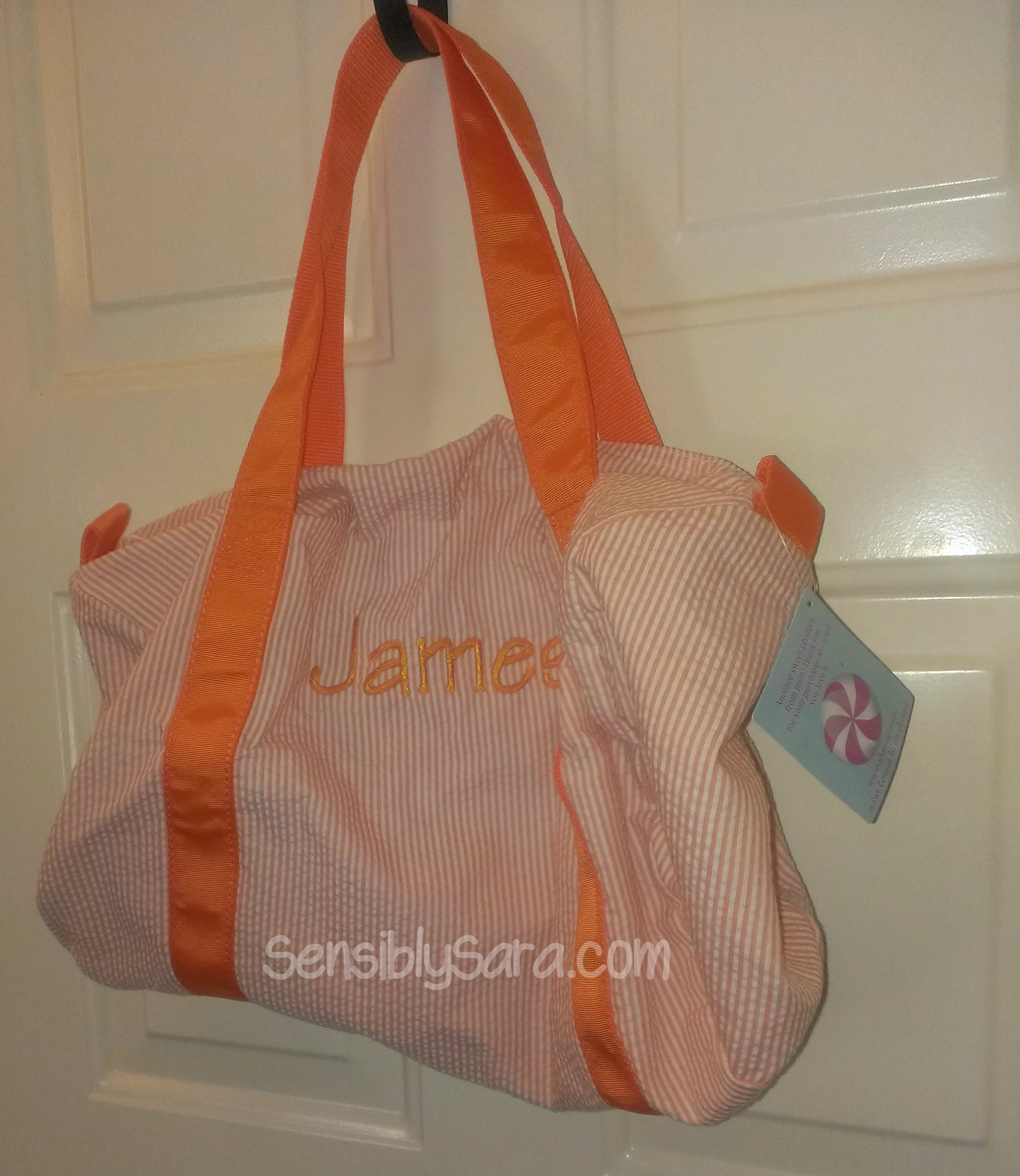 I was able to choose from their selection of boys duffle bags. I really, really liked the Cadet Mint but they were out of stock. So I went with the Orange Seersucker Mint. The more I thought about it, the more I thought it looked a little “girly” but after it arrived, I changed my mind! James likes it and so do I!